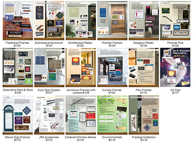 17 separate 4-color sales brochures highlighting holders and frames are perfect for mailers, salespersons, or catalog pages. These sheets are designed to be custom imprinted with your name, address and logo.