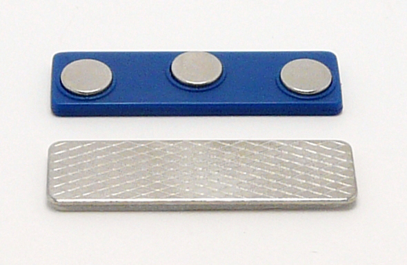 Economy Magnetic Badge Attachment 1/2 x 1 3/4 Triple Post magnet with peel off Adhesive. Magnetic badge findings are a very popular attachment method to secure name badges to clothing. Our magnets are available in a variety of sizes, weights and strengths. Transform any ID card into a wearable badge that won't damage your clothing. All magnets include adhesive backing.